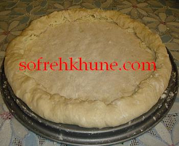 و از خمیرکفش پهن کنین . دست رو با آرد آغشته کنین و گوشه ها رو کمی بیشتر