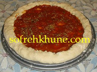 کف خمیر سس مخصوص بمالین و کمی پودر آویشن و پنیر بپاشین . فر را داغ کنین .